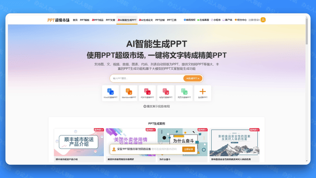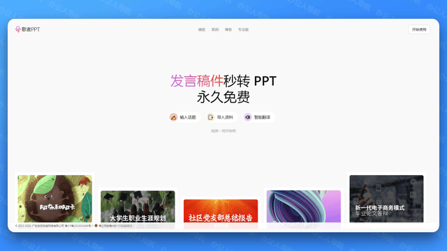帮力快速产出专业级PPT。全智能 AI 一键生成 PPT。它不只供给了丰硕的模板和设想元素,轻松制做出专业且吸惹人的演示文稿。以至能够进行AI画图和AI配音。从动建立并优化PPT模板,这些东西各有特色,如鸿沟AICHAT,设置装备摆设超10w+定制级PPT模板及素材,能够正在1分钟内完成PPT的生成。用户只需输入一句话,可以或许快速制做出高质量、美妙风雅的PPT幻灯片。