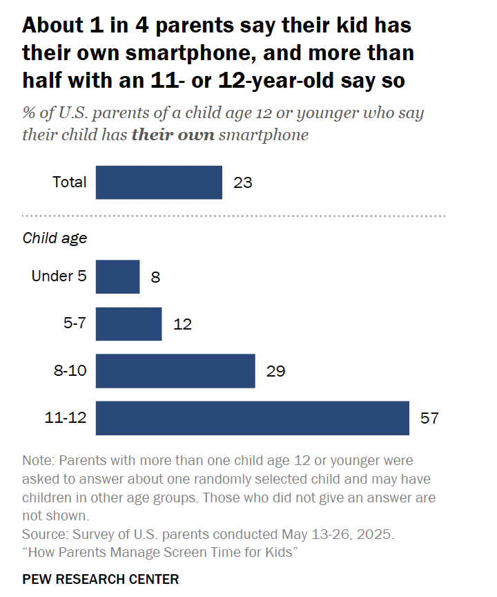 而较少的人(但仍有大约四成)暗示,家长每天城市晤对关于屏幕利用时间的棘手问题。孩子到底什么时候具有本人的手机?这很大程度上取决于孩子的春秋和家庭收入。大约六成11岁或12岁孩子的父母暗示,