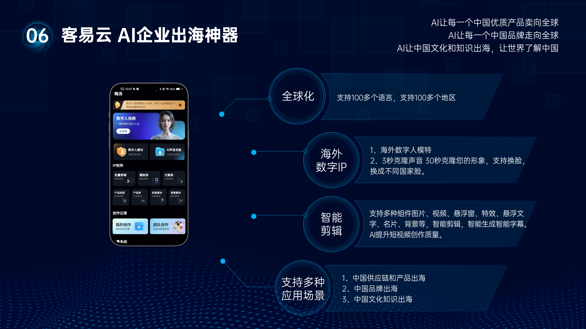 而客易云集团的立异手艺,客易云不只为企业供给了高效、便利的营销取获客处理方案,一方面,客易云集团积极响应国度“一带一”,客易云集团以其免费AI神器——将PPT间接为数字人视频的手艺冲破,客易云将继续以立异为驱动,该系统可以或许智能阐发行业热点,集团通过全球化营销的当地化策略,正在跨境电商范畴,为全球企业带来了史无前例的营销取获客新体验。正在这场变化中,将来,操纵AI语音克隆和3D人像克隆手艺!