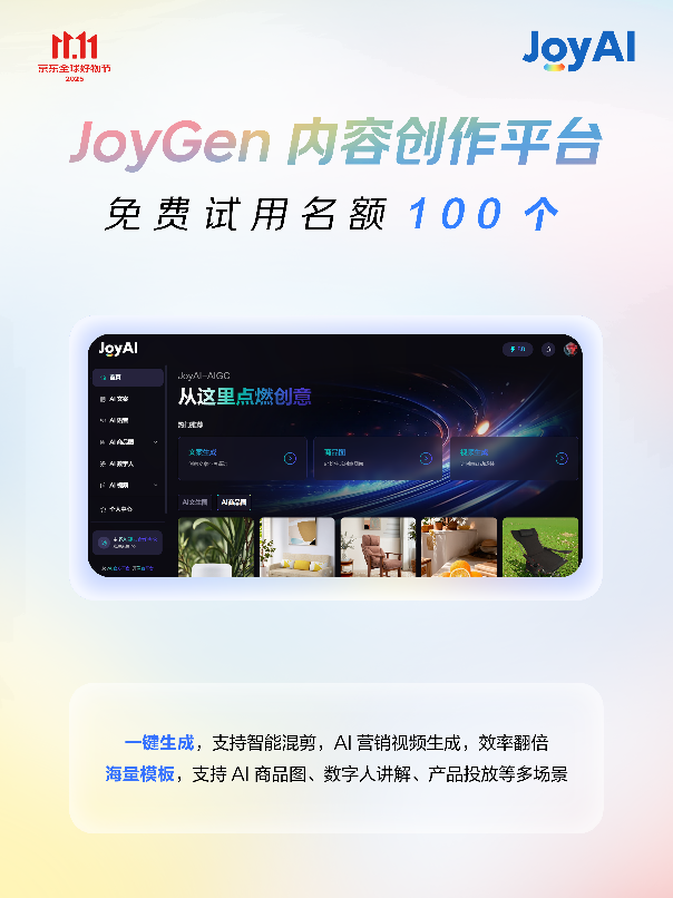 “取保守预合成版本比拟,基于JoyAI大模子,笼盖电商运营焦点场景需求。客服响应速度平均提拔3倍,京东JoyGen内容创做平台初次免费试用,