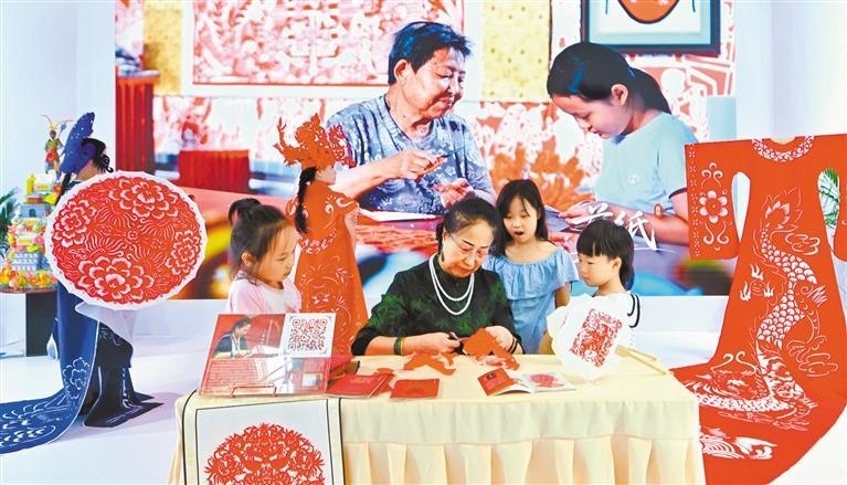 山西影视集团展区,国度级非遗代表性项目中阳剪纸市级代表性传承人武小汾正在吕梁市展区和小伴侣进行剪纸互动。妙语解颐;穿越古今。